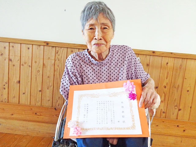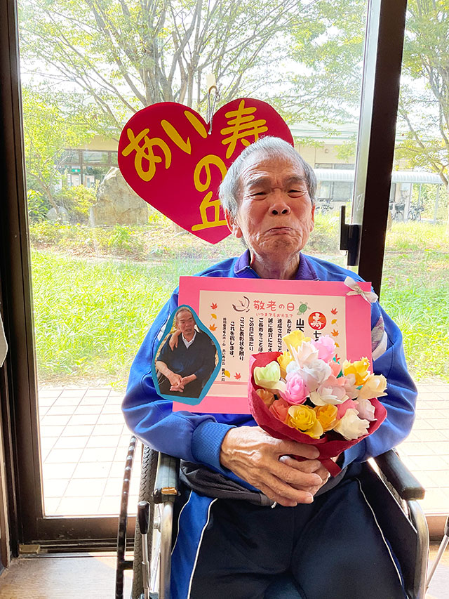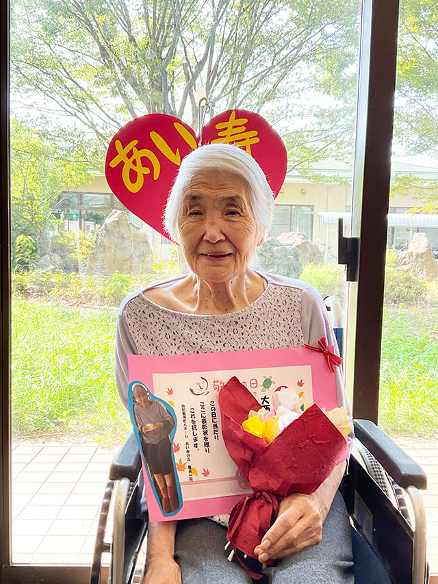 あい寿の丘では、還暦・古稀· 喜寿・米寿・卒寿・白寿のお祝いに、祝い状と花束を用意してお祝いしました。