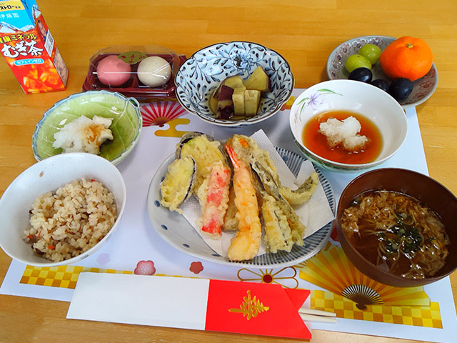 みなみ苑では、昼食にお祝いメニューとして揚げたての天ぷらを提供しました。