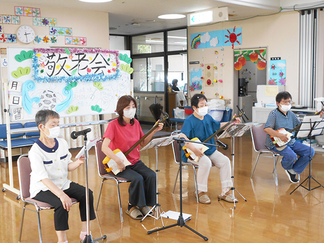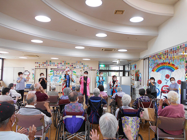 南知多町デイサービスでは、三味線の慰問・職員のパフォーマンス・ご利用者と職員での人間紙芝居にてお祝いさせて頂きました。