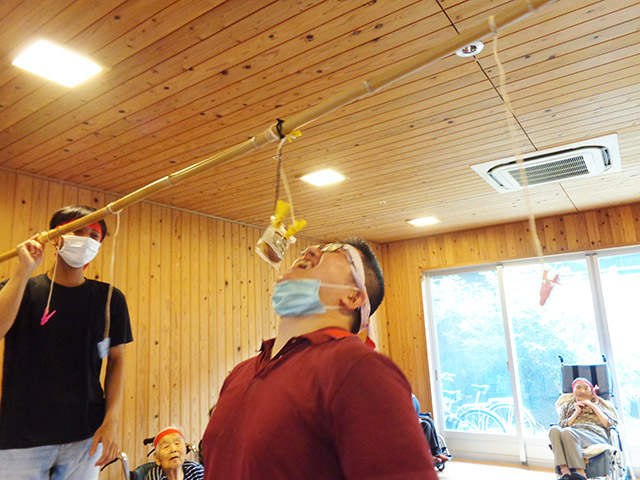 パン食い競争では職員も参加し、その様子を見て応援の声を送るご利用者もみえました。