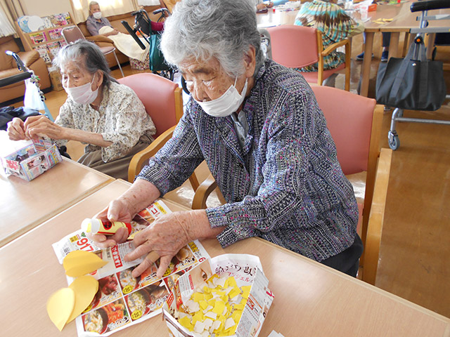 ご利用者は、茶色のお花紙を丸めてひまわりの芯を作ったり、色画用紙にお花紙を貼り、職員が花火の形に並べました。